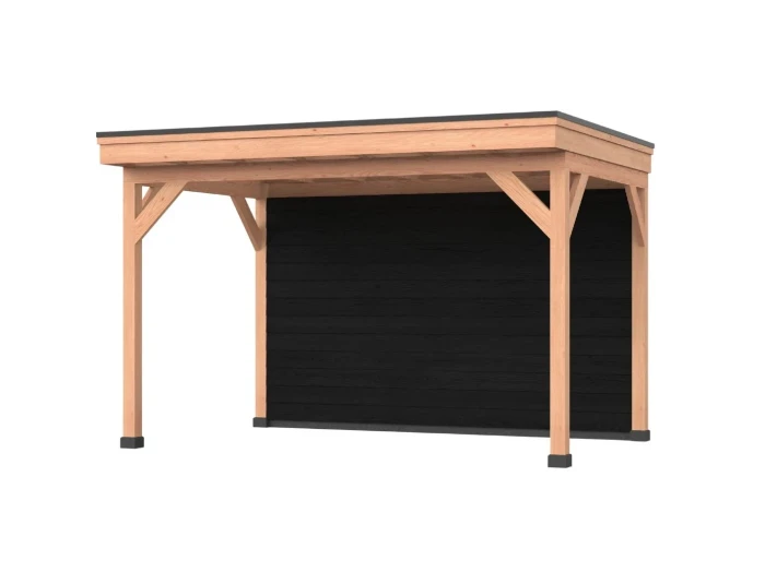 Combinatie 3 bestaat uit de overkapping met een enkelzijdige achter- en zijwand. De wanden bestaan uit douglas zweeds rabat planken van 195 mm, regelwerk en bevestigingsmateriaal.