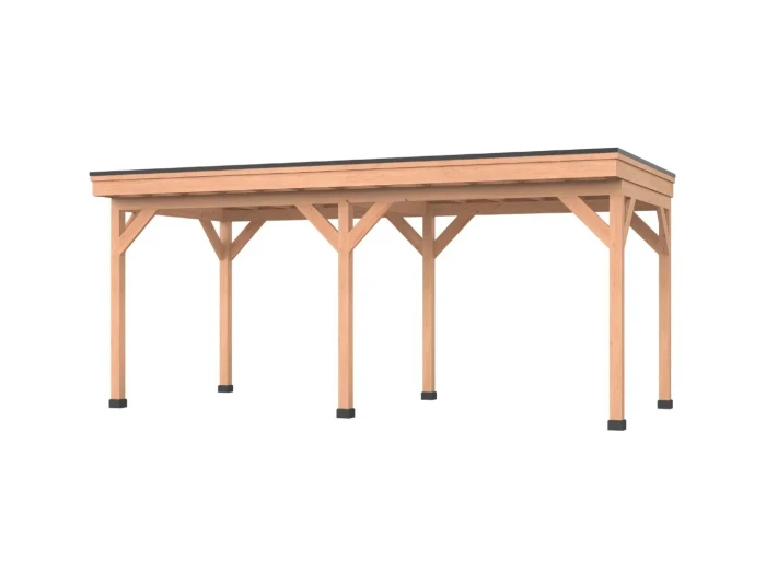 Het platte dak is opgebouwd uit fijnbezaagd douglas dakbeschot en kan waterdicht worden afgewerkt met EPDM dakfolie en aluminium daktrimmen. Daarnaast is er een hemelwaterafvoerset, inclusief EPDM dakdoorvoer, verkrijgbaar in pvc en zink.