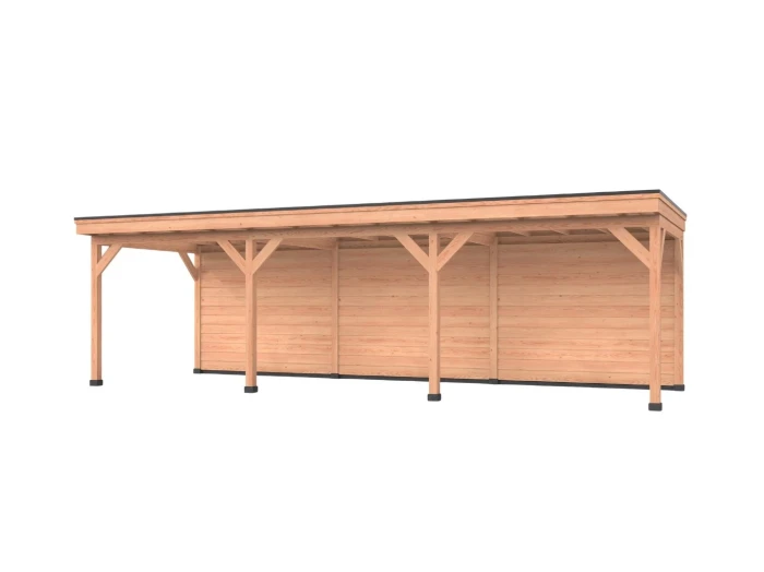 Het platte dak is opgebouwd uit fijnbezaagd douglas dakbeschot en kan waterdicht worden afgewerkt met EPDM dakfolie en aluminium daktrimmen. Daarnaast is er een hemelwaterafvoerset, inclusief EPDM dakdoorvoer, verkrijgbaar in pvc en zink.