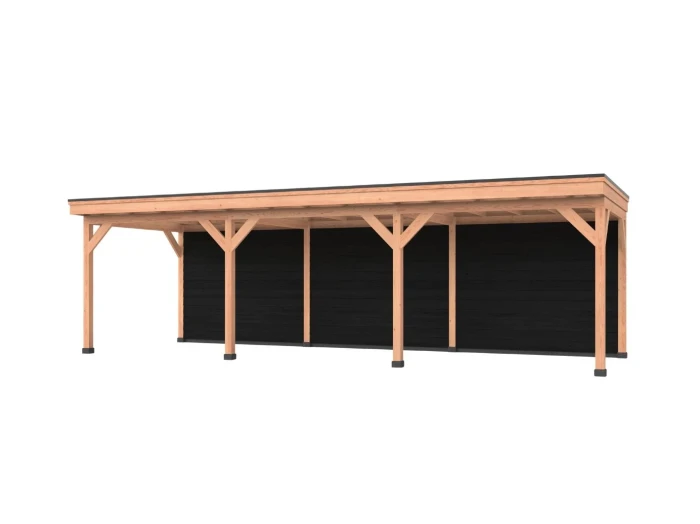 Combinatie 2 bestaat uit de constructie met één enkelzijdige wand van zweeds rabat planken. De wand bestaat uit douglas zweeds rabat planken van 195 mm, regelwerk en bevestigingsmateriaal. Onze zwarte Zweeds Rabat planken worden twee keer zwart gespoten voor een dekkende zwarte kleur én een langere levensduur. De zwarte kleur (RAL 9005) blijft jarenlang mooi en vergrijsd niet snel.